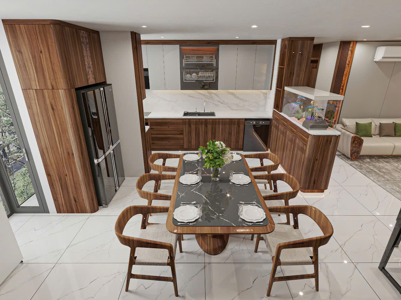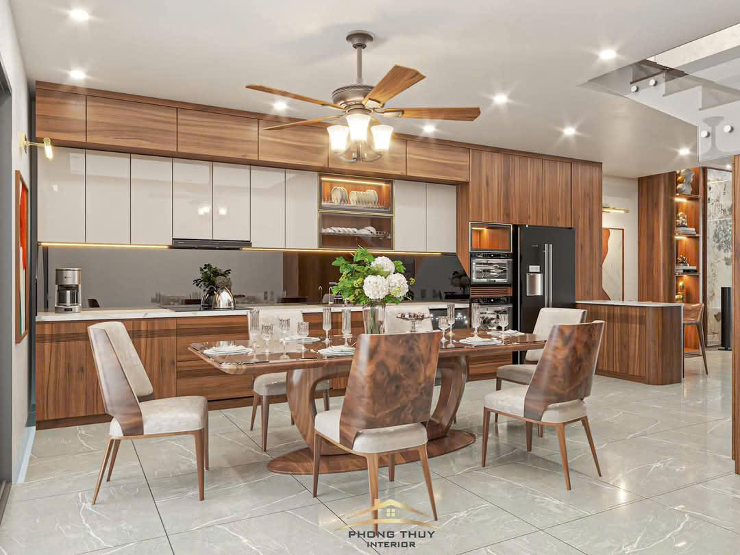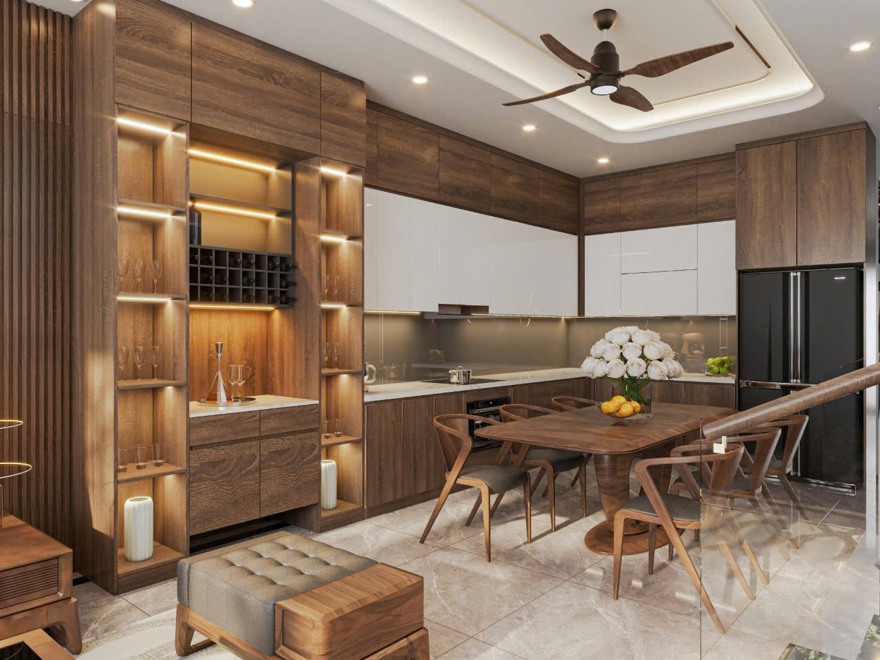 Phòng khách và bếp, tông màu gỗ Óc Chó kết hợp trắng, Chất liệu MDF phủ melamine cốt gỗ lõi Vananchai xanh Thái Lan, sản xuất trên công nghệ mới CNC cắt ghép phối màu theo yêu cầu thẩm mỹ, kỹ thuật hiện đại.