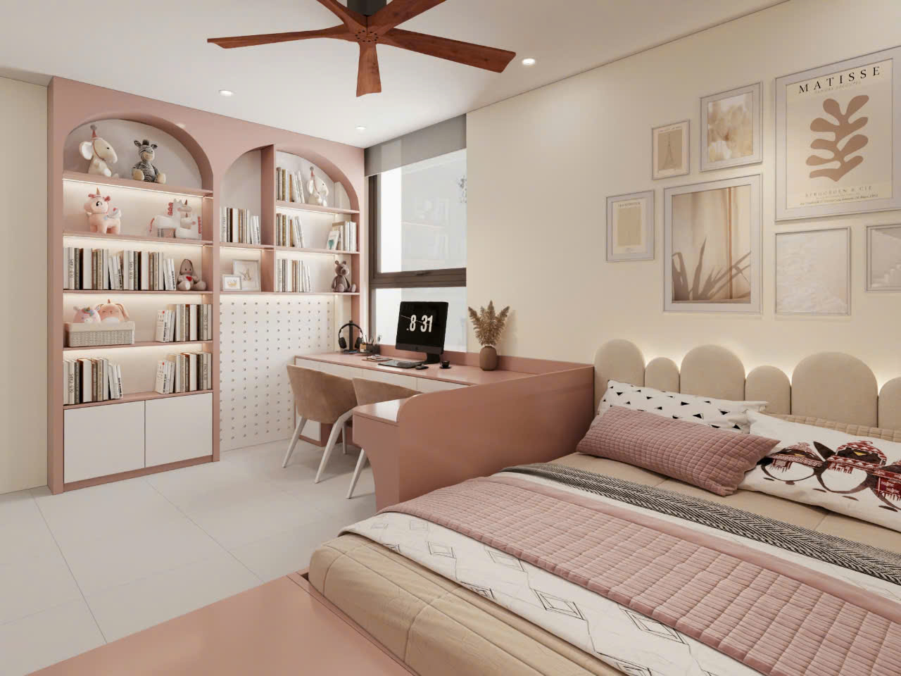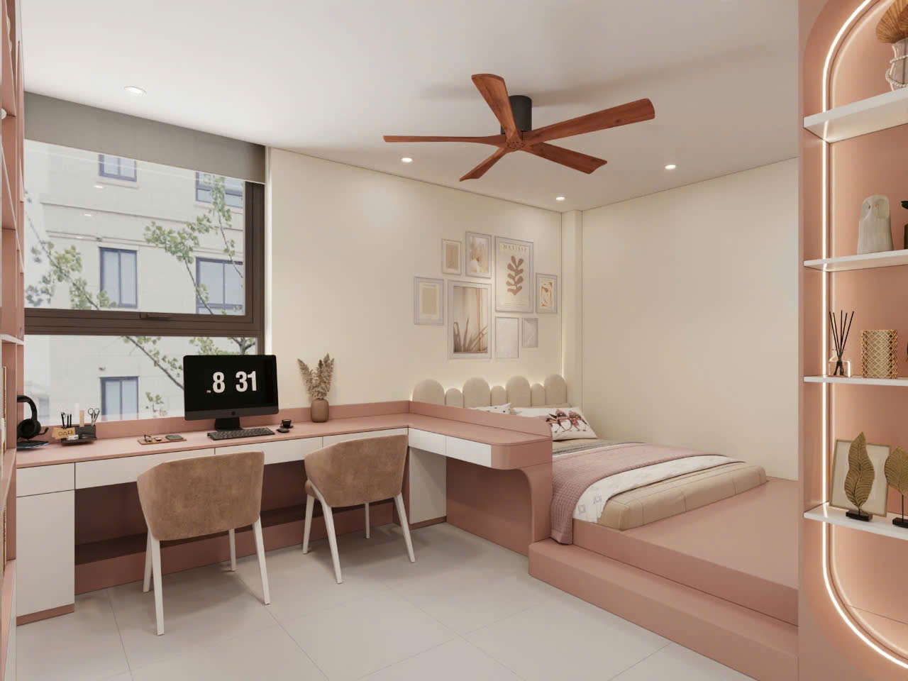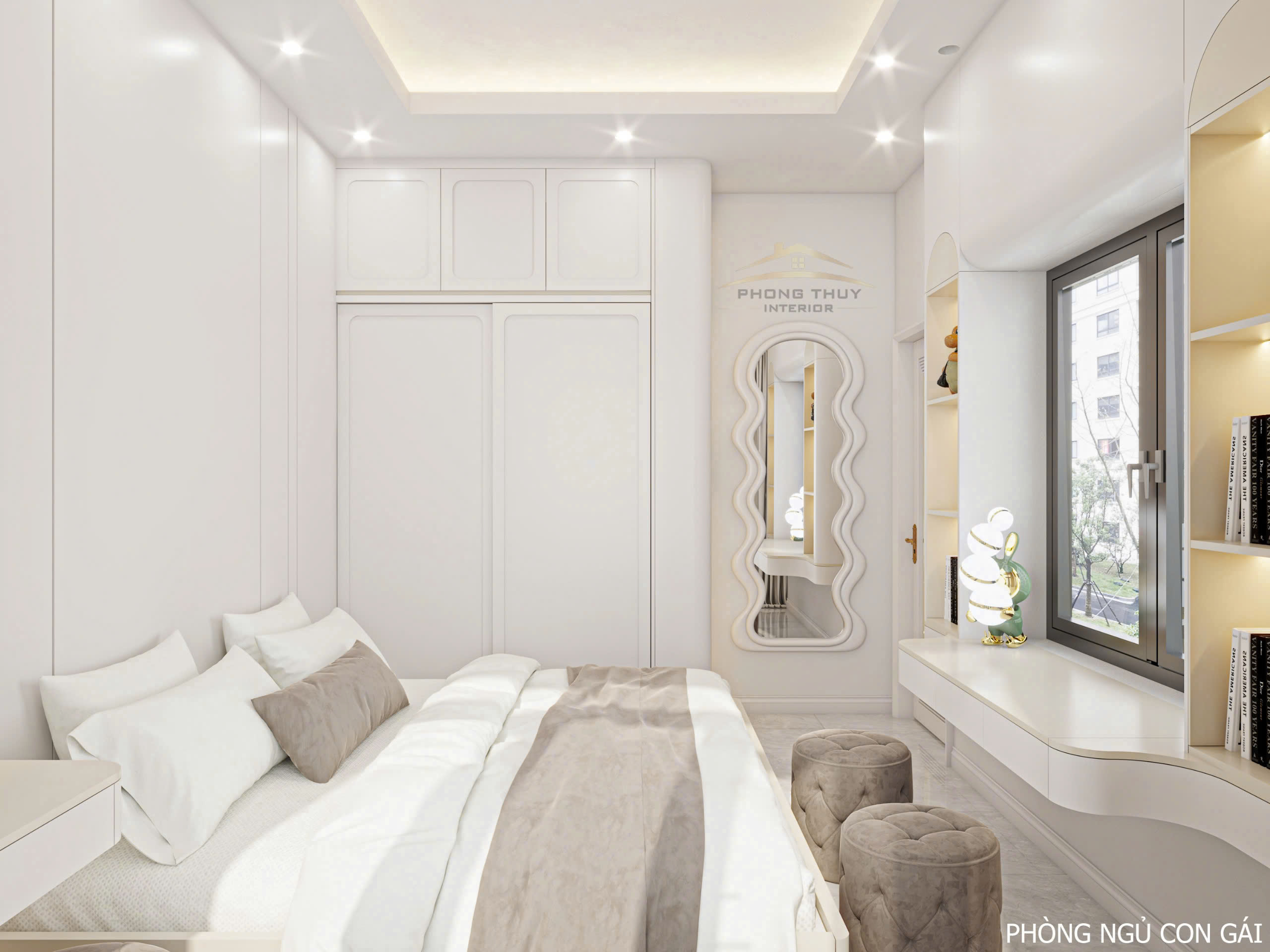 Phòng ngủ con Gái , tông màu trắng kết hợp màu gỗ vàng nhạt, Chất liệu MDF phủ melamine cốt gỗ lõi Vananchai xanh Thái Lan, sản xuất trên công nghệ mới CNC cắt ghép phối màu theo yêu cầu thẩm mỹ, kỹ thuật hiện đại.