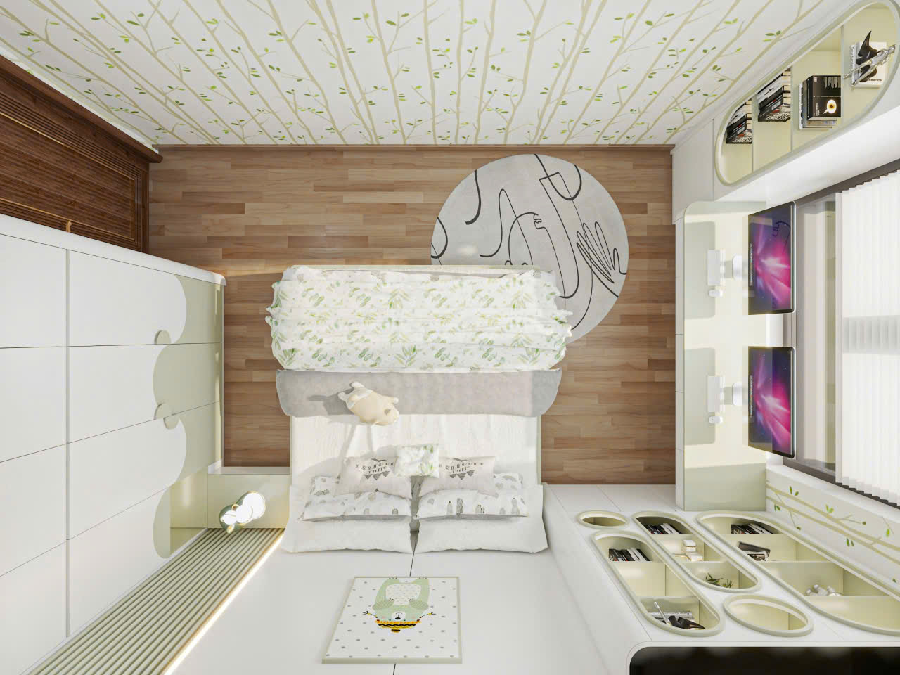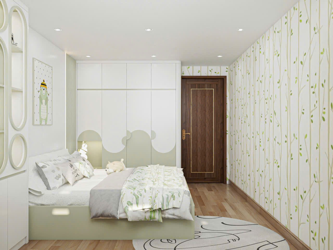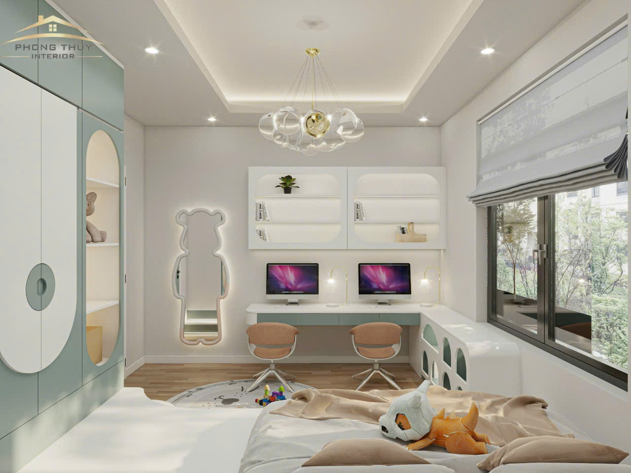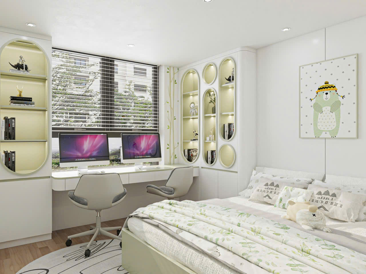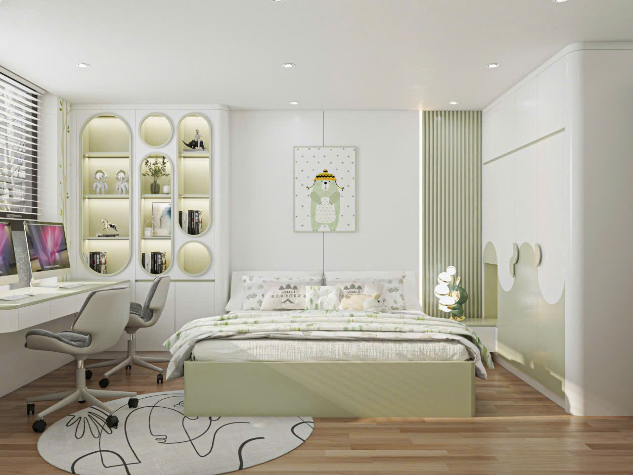 Phòng ngủ con trai, tông màu trắng kết hợp màu xanh Quân Đội, Chất liệu MDF phủ melamine cốt gỗ lõi Vananchai xanh Thái Lan, sản xuất trên công nghệ mới CNC cắt ghép phối màu theo yêu cầu thẩm mỹ, kỹ thuật hiện đại.