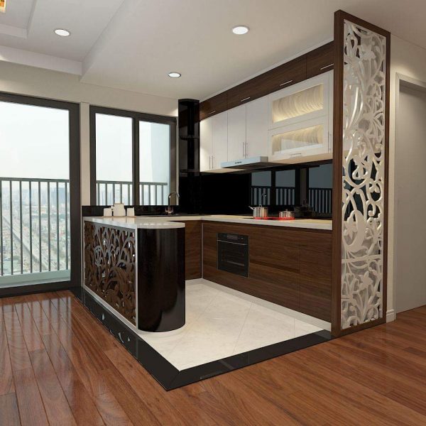 Để ngăn cách không gian bếp với không gian phòng khách, bàn ăn, kiến trúc sư NỘI THẤT ANHOME thiết kế vách CNC cùng bàn đặt đồ ăn hết sức khéo léo, đường nét tinh tế tạo tính thẩm mĩ cao, sang trọng cho không gian.
