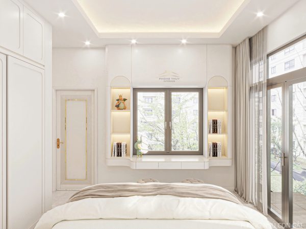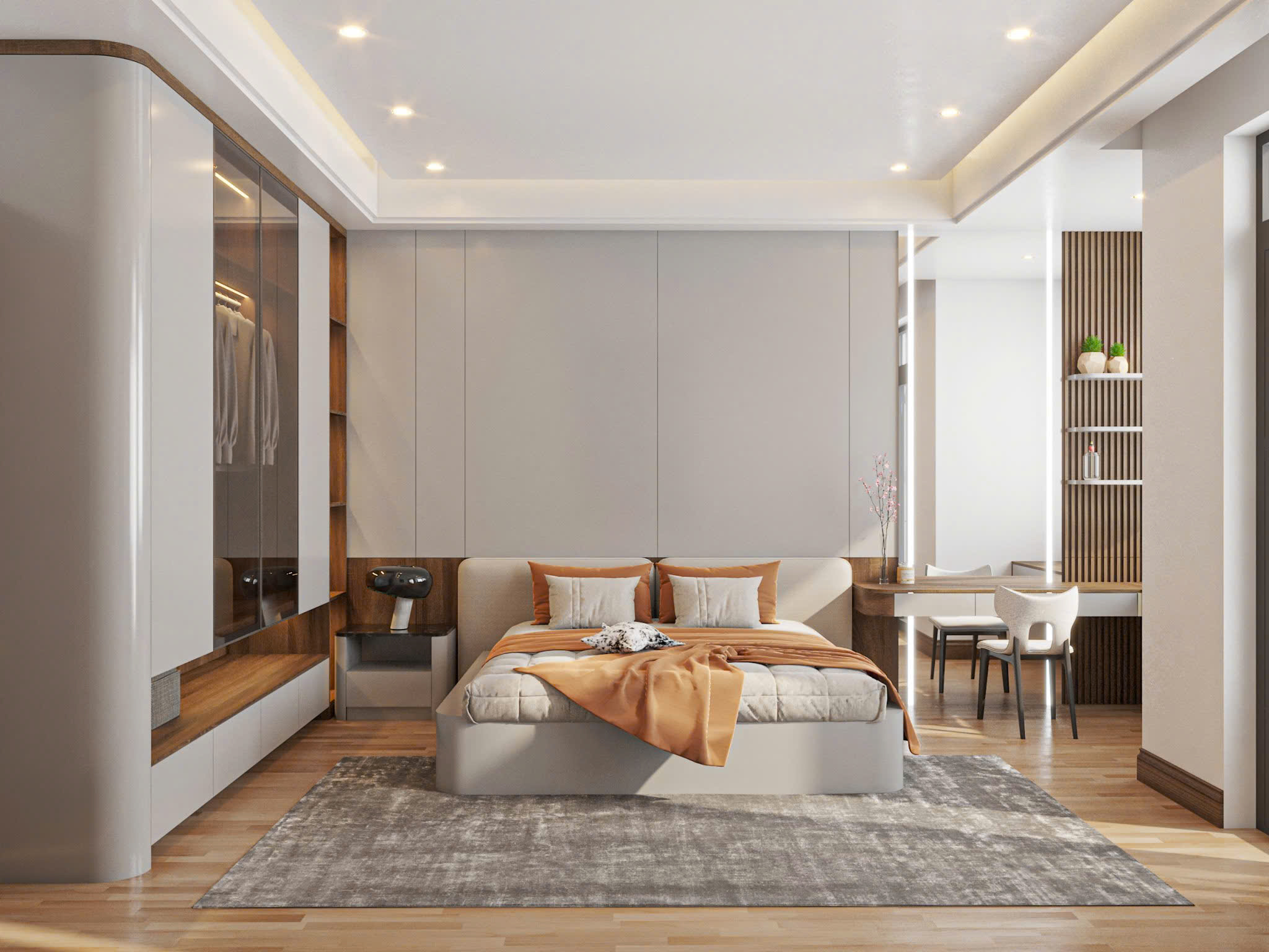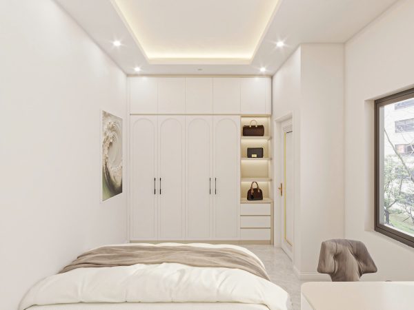Tủ quần áo kết hợp tủ trang trí giúp không gian phòng thêm thông thoáng, tăng tính thẩm mĩ hơn cho không gian phòng ngủ Master.