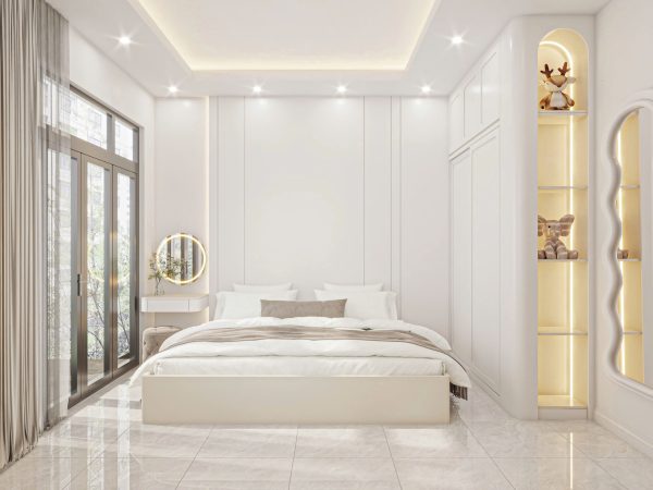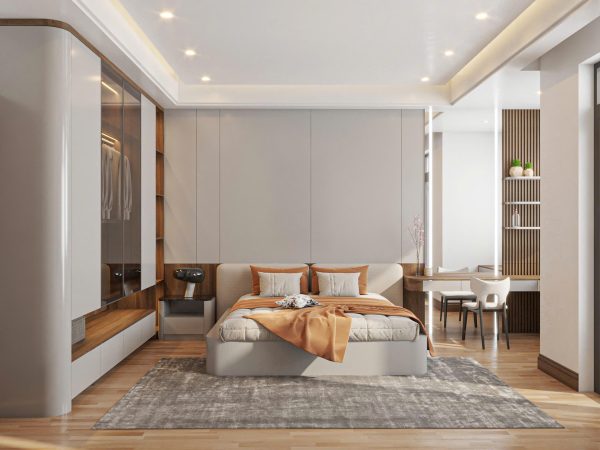 Để đem đến cảm giác thoải mái nhất cho gia chủ, NỘI THẤT ANHOME không sử dụng quá nhiều nội thất trong phòng ngủ, chỉ dừng lại ở giường ngủ, tab đầu giường và tủ quần áo. Giường ngủ được thiết kế theo kiểu dáng đơn giản, hiện đại, đầu giường bọc nệm vải cao cấp mang đến nhẹ nhàng khi dùng.