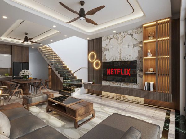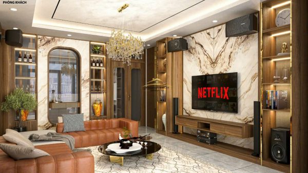 Chất liệu thi công, sofa chất liệu gỗ trần bì, được bao bọc bởi bề mặt da nhập khẩu cao cấp, những hệ tủ trang trí chất liệu gỗ Mdf phủ Melamine An Cường, gam màu trầm tạo sự ấm áp, gần gũi cho không gian.