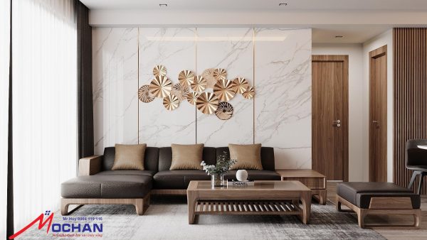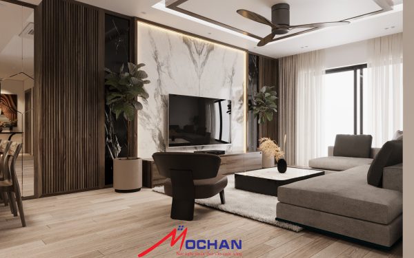 Phòng khách hiện đại thiết kế và thi công chát liệu MDF chống ẩm phủ Acrilic và MDF phủ sơn IMCHEM cao cấp, tông màu gỗ óc chó giúp phòng khách sang trọng, lịch lãm, và đặc biệt không mất đi vẻ tự nhiên trong nội thất