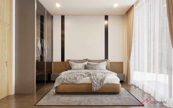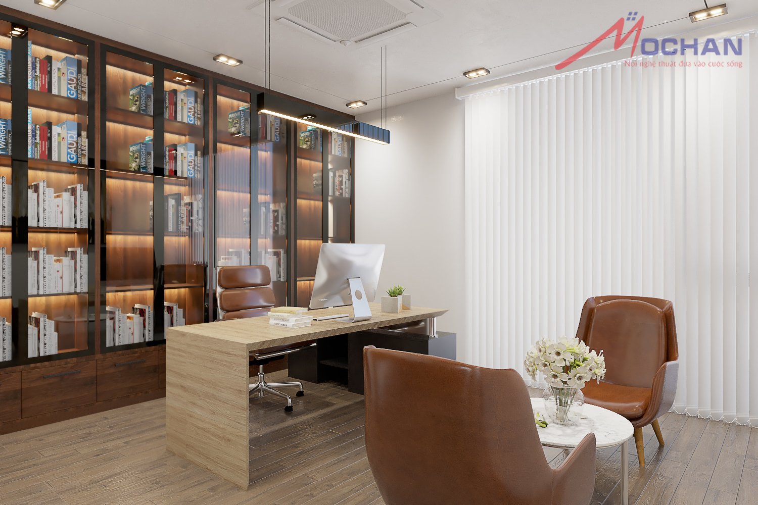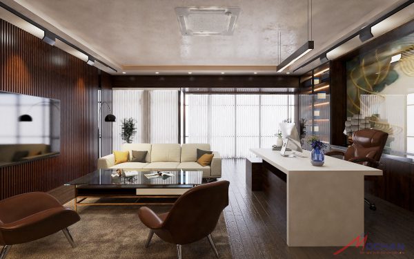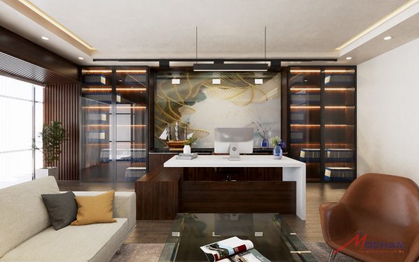 Ở đây, chúng tôi cũng chọn màu hợp với sinh khí, mệnh của công ty nhưng không quá sặc sỡ, thể hiện được sang trọng nhưng đầm ấm, gần gũi của một vị lãnh đạo . Tông màu chủ đạo được Mộc Hân lựa chọn màu vân gỗ óc chó kết hợp màu trắng, tạo khối màu cân đối cho phòng.