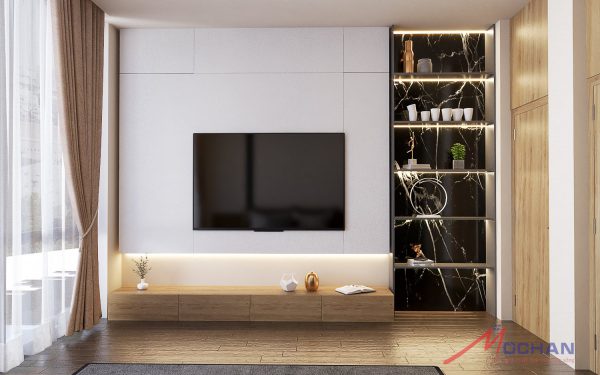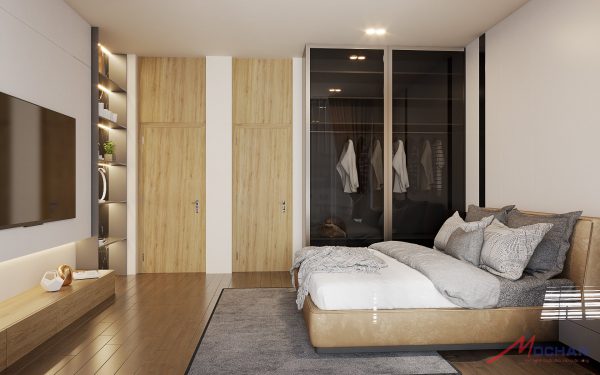 Với xu hướng lấy sáng tự nhiên cho phòng, hạn chế sử dụng ánh đèn, chúng tôi thiết kế kệ thông cửa kính tạo cảm giác thông thoáng hơn cho phòng. Với cách thiết kế này , ta có thể ngắm cây phía ngoài ban công , cũng có thể nhìn ngắm vẻ đẹp của thành phố.