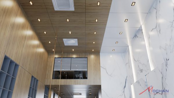 Trần tầng 1, ANHOME DESIGN thiết kế dựa trên phong thủy của chủ đầu tư , chủ đạo màu vàng mã Laminate 388 và mã Laminate 5-006A trắng , kết hợp đèn âm trần tạo sự cân đối, hài hòa về màu sắc .