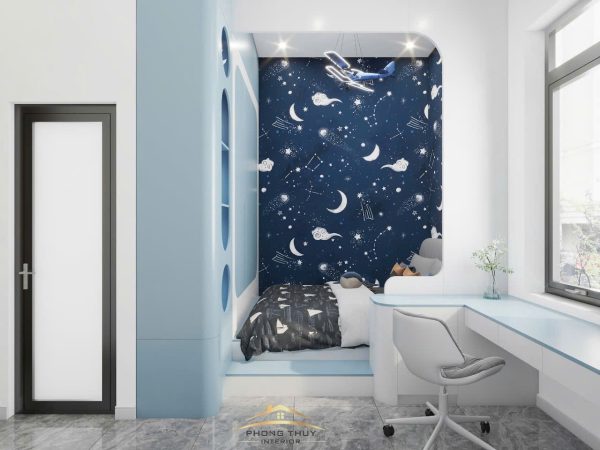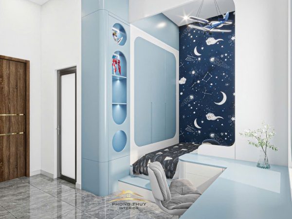 Phòng ngủ con 2 được chúng tôi thiết kế chủ yếu theo gam màu chủ đạo của ngôi nhà, trang trí thêm búc tranh nghệ thuật tạo nét riêng cho phong cách của chủ phòng.