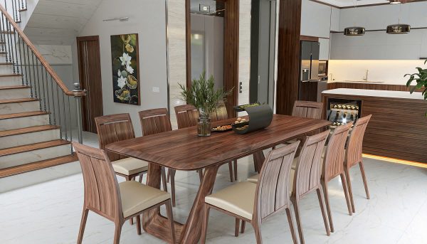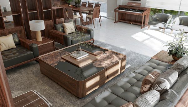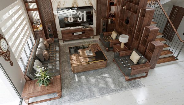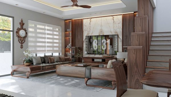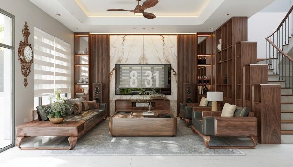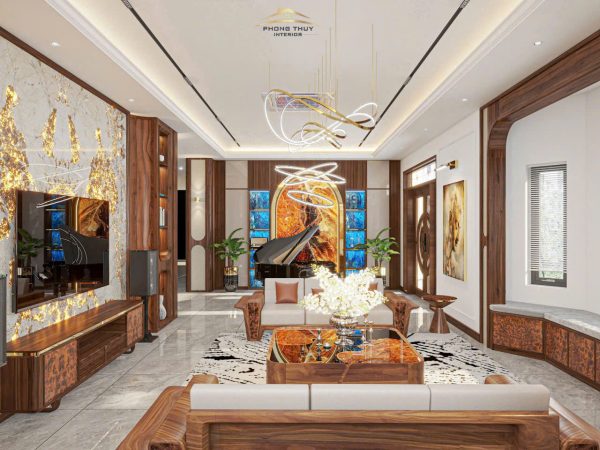 Phòng khách biệt thự được thiết kế theo phong cách cổ điển. Trong đó, điểm nhấn ấn tượng và đầy sang trọng chính là nội thất gỗ công nghiệp vân óc chó. Do tài chính tương đối mạnh và đảm bảo nên gia chủ mong muốn kiểu dáng một phòng khách vừa đẹp vừa độc đáo để làm nên không gian tiếp khách tuyệt vời cho gia đình.