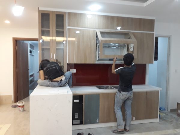 Chất liệu thi công, Gỗ Mdf chống ẩm, cánh phủ acrylic kết hợp thùng melamine dễ vệ sinh, lau chùi khi bám bẩn, giữ cho nội thất luôn sáng bóng, sạch sẽ , tạo không gian vừa gọn gàng, ngăn nắp vừa hiện đại.