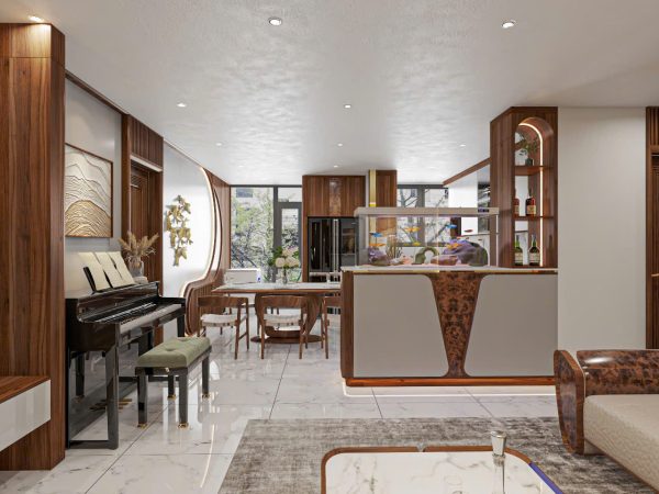Phòng khách và bếp, tông màu gỗ Óc Chó kết hợp trắng, Chất liệu MDF phủ melamine cốt gỗ lõi Vananchai xanh Thái Lan, sản xuất trên công nghệ mới CNC cắt ghép phối màu theo yêu cầu thẩm mỹ, kỹ thuật hiện đại.