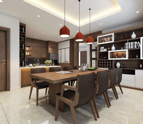 Thiết kế nội thất phòng ăn có cảm hứng từ vẻ đẹp Châu Âu sang trọng và khỏe khoắn. Bộ bàn ăn 8 người được thiết kế với đường nét khỏe khoắn được đặt dưới hệ thống đèn dọi giữa căn phòng ăn đã tôn nên không gian sang trọng. Bộ tủ rượu được thiết kế và trang trí làm nội bật sự hiện đại, tiện nghi mà ngăn nắp của phòng.
