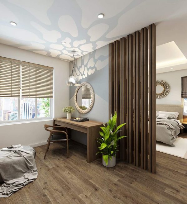 Thiết kế nội thất phòng ngủ chung cư mang vẻ đẹp lịch lãm hơi hướng sang trọng châu Âu rất phù hợp với những doanh nhân thành đạt. Giường ngủ phòng ngủ được thiết kế bằng gỗ tự nhiên cao cấp bọc đệm mềm mại tạo ra sự thoải mái nhất cho giấc ngủ của gia chủ. Vách ngăn sử dụng thiết kế có phần cách điệu khi kết hợp với những thanh gỗ nâu sang trọng đã giúp tôn lên không gian sang trọng của căn phòng. Bàn trang điểm nhỏ xinh ngay gần cạnh cửa sổ tạo cảm giác thoải mái, trong lành cho các chị em.