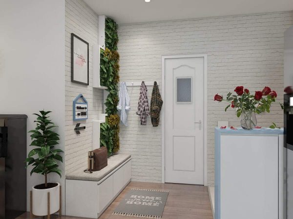 Đi từ ngoài cửa vào, tủ trang trí, vật dụng trang trí, bình hoa tươi đều được sắp xếp hài hòa tạo nên cảm giác thoải mái mỗi khi về nhà. Tủ giày và kệ ngồi cùng giàn hoa giả khiến cho khu vực cận cửa sinh động hơn.