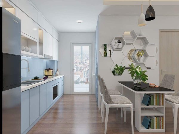 Phòng khách và phòng bếp của căn chung cư được thiết kế liên thông gần kề với nhau nhằm tạo không gian thông thoáng hơn cho căn hộ có diện tích khá nhỏ này.
