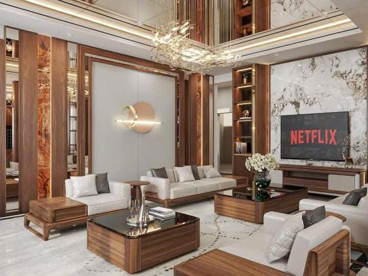 Phòng khách biệt thự được thiết kế theo phong cách cổ điển. Trong đó, điểm nhấn ấn tượng và đầy sang trọng chính là nội thất gỗ công nghiệp vân óc chó. Do tài chính tương đối mạnh và đảm bảo nên gia chủ mong muốn kiểu dáng một phòng khách vừa đẹp vừa độc đáo để làm nên không gian tiếp khách tuyệt vời cho gia đình.