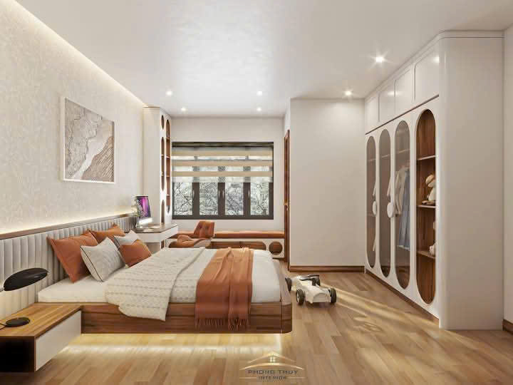 Gam màu ấm cúng làm chủ đạo, tạo nên cảm giác yên bình cho một giấc ngủ tuyệt vời. Thiết kế tận dụng được ánh sáng tự nhiên, tạo nên cảm giác gọn gàng, bắt mắt cùng với hệ thống rèm cửa điều chỉnh ánh sáng dễ dàng.