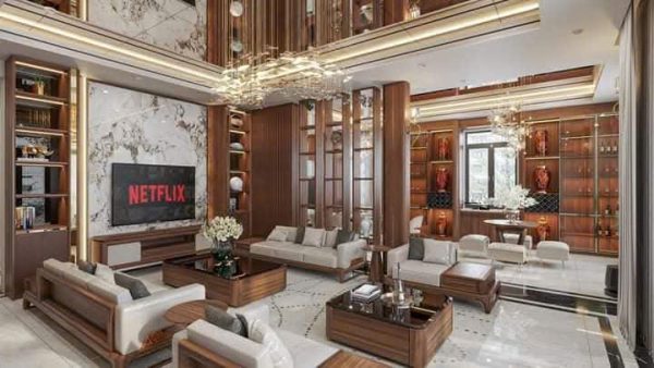 Phòng khách biệt thự được thiết kế theo phong cách cổ điển. Trong đó, điểm nhấn ấn tượng và đầy sang trọng chính là nội thất gỗ công nghiệp vân óc chó. Do tài chính tương đối mạnh và đảm bảo nên gia chủ mong muốn kiểu dáng một phòng khách vừa đẹp vừa độc đáo để làm nên không gian tiếp khách tuyệt vời cho gia đình.