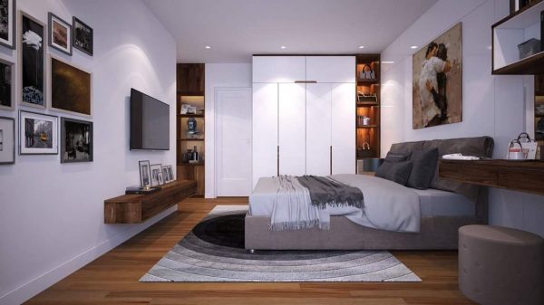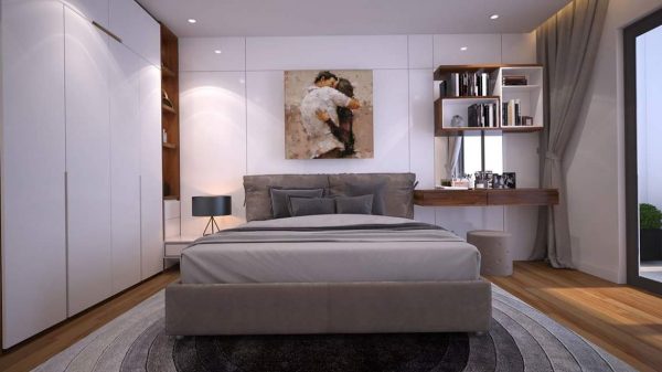 Thiết kế nội thất phòng ngủ master với lối thiết kế đơn giản. Lấy giường ngủ là trung tâm của căn phòng và bố trí nội thất cân bằng 2 bên. Một lần nữa sự kết hợp tinh tế màu sắc đã tạo ra một không gian đẳng cấp khác biệt. Một bức tường đầu giường ngủ màu trắng kết hợp với màu xám trầm của gối ngủ trên nền màu trắng của trần nhà và tủ quần áo, màu nâu của gỗ lát sàn đã làm bật cả không gian. Vẫn sang trọng, lịch thiệp nhưng tràn đầy sức sống.