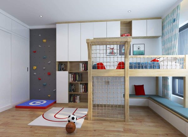 Thiết kế phòng ngủ cho con sinh động và đáng yêu. Sử dụng đồ nội thất thông minh cho phòng ngủ bé như bộ giường ngủ 2 tầng, tận dụng gầm giường làm nơi nghỉ ngơi, tủ âm tường tiết kiệm không gian và ngăn nắp.