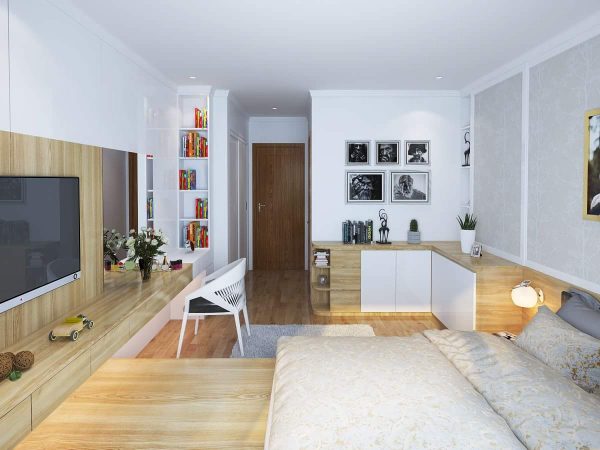 Giường ngủ được thiết kế bằng gỗ MDF chống ẩm, tuổi thọ sử dụng lâu dài đã tiết kiệm khoảng chi phí thi công nội thất. Kệ tivi và kệ trang trí đều được sử dụng cách thiết kế hiện đại màu sắc đồng điệu với giường ngủ tạo nên một không gian nội thất có sự đồng nhất.