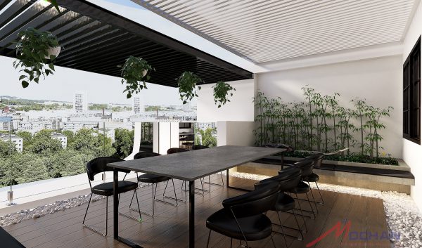 Đặc biệt, Mộc Hân thiết kế nội thất văn phòng LOGIA sân thượng tầng 5, quán cafe mini với đầy đủ các yếu tố như một quán cafe bình thường với cây xanh, hoa cỏ, lấy ánh sáng từ nắng tự nhiên giúp có những phút thư giản thư thái nhất sau những giờ trong điều hòa, những lúc làm việc căng thẳng.