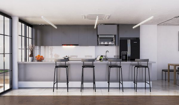 Tủ bếp thiết kế công năng như tủ bếp gia đình, kết hợp bàn đảo giúp tăng không gian sử dụng bếp cho nhiều người cùng lúc, tủ bếp dưới chất liệu khung thùng gỗ nhựa chịu nước tuyệt đối, cánh ACRYLIC no line An Cường, phụ kiện giá xoong nồi, giá gia vị dao thớt, các phụ kiện khác hãng Hafele nhập khẩu Đức.
