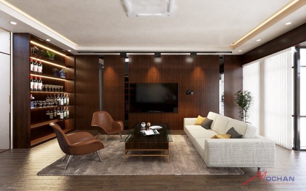 Khu tiếp khách thiết kế theo phong cách gia đình có sofa, ghế thư giãn tạo cảm giác thư thái, dễ chịu. Đặc biệt là tủ rượu tạo cho không gian đang làm việc tại căn phòng của khách sạn 5 sao cao cấp.
