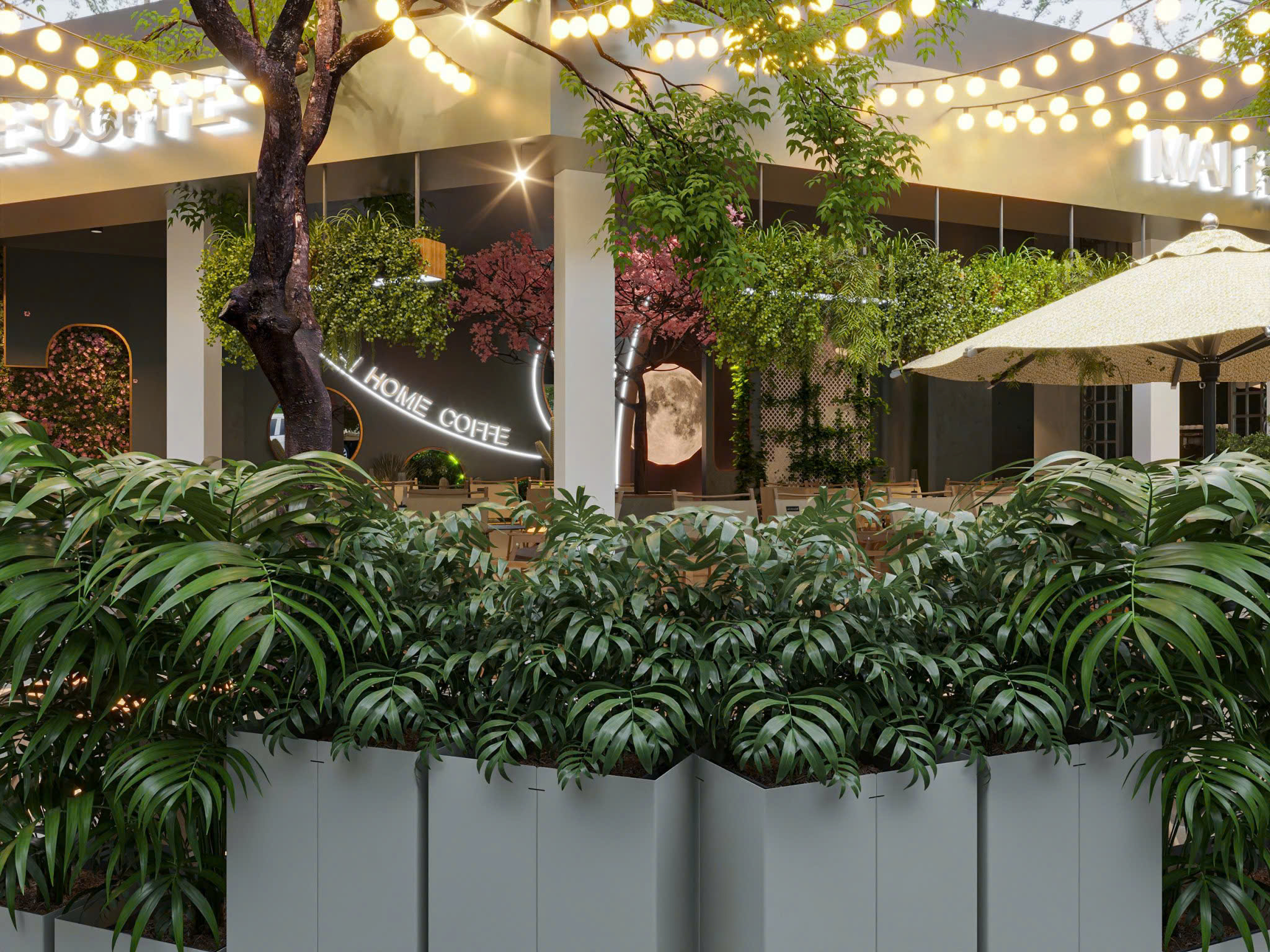 Việc kết hợp cây xanh trong quán cafe rất hợp lý,bởi vì cây xanh sẽ giúp không gian trở nên dễ chịu hơn.Công trình được hoàn thiện thiết kế và thi công trong vòng 2 tuần.